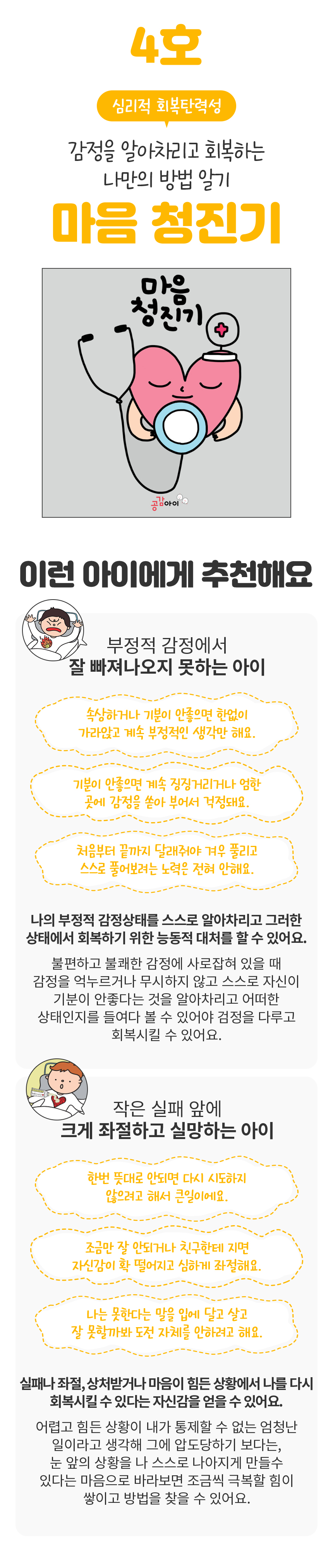 4호 <마음청진기>는 네 번째 호수로 '심리적 회복탄력성'을 주제로 한 놀이로, 마음병원 활동을 통해 스스로 마음을 진찰하고 진단하고 치료하는 구체적 방법을 연습합니다.
