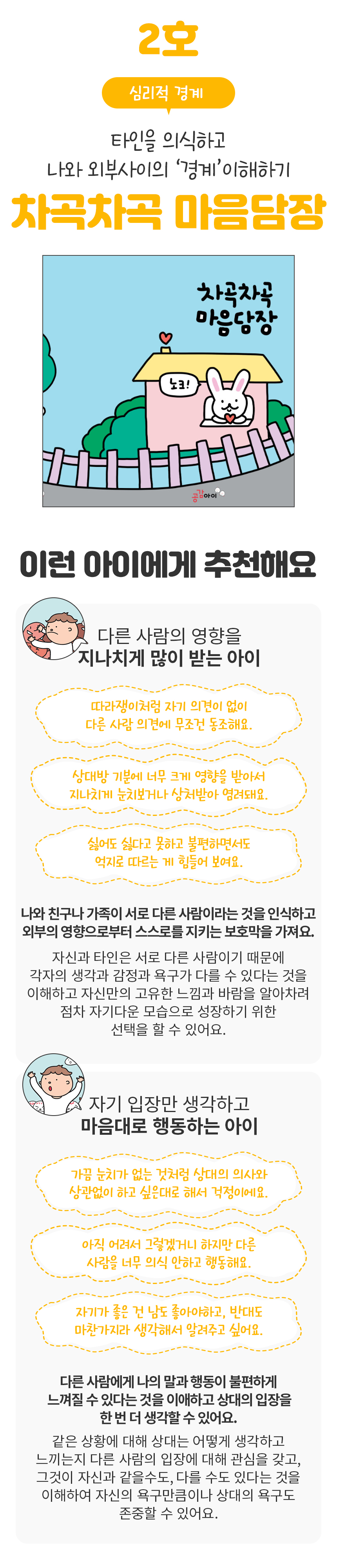 2호 <차곡차곡 마음담장>은 두 번째 호수로 '심리적 경계'를 주제로 하며, 마음담장 놀이를 통해 자신과 타인 사이의 적정한 '선'을 배우고 지키는 연습을 합니다.